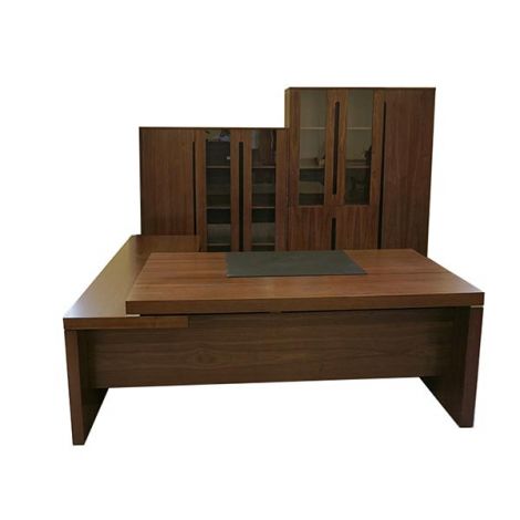 Меблі покриті натуральним шпоном дуба. Основу стільниці складає МДФ-плита. Цей матеріал більш практичний, ніж класична деревина. Усередині плита має однорідне наповнення: відсутні різні мікротріщини, сучки та зазори. Завдяки цьому стіл прослужить своєму власнику далеко не один рік, витримуючи механічну дію та температурні перепади. Захист від вологи даному столу для керівника забезпечує покриття з високоякісного натурального шпону.