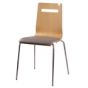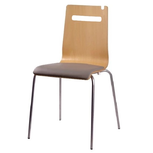 Базова ціна стільця з хромованими ніжками або фарбованими в чорний колір, сидіння та спинка букова фанера-10,5 мм., під лаком, колір-Бук. Стілець для кафе, барів, ресторанів із гнутої фанери з різними модифікаціями металевих ніжок та варіантами м'якого сидіння. Тильна сторона спинки – фанера. На спинці стільця є виріз для руки, та виріз для сумки. За додаткову оплату можливе фарбування сидіння по таблиці RAL.